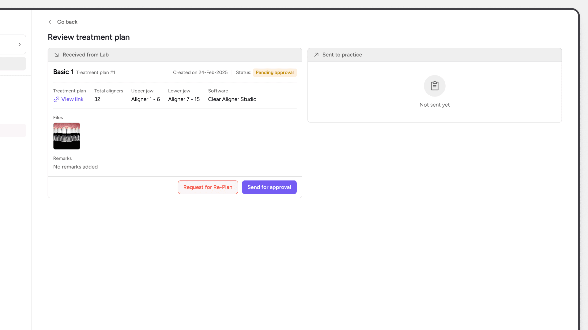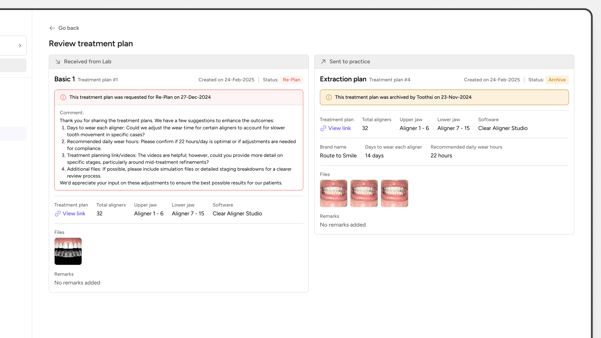 If a plan has already been sent to a Clinician and later re-planned by the Aligner company, the older plan is automatically archived on the Clinician side to avoid outdated approvals.